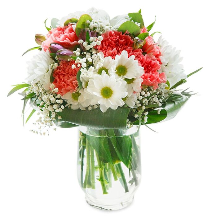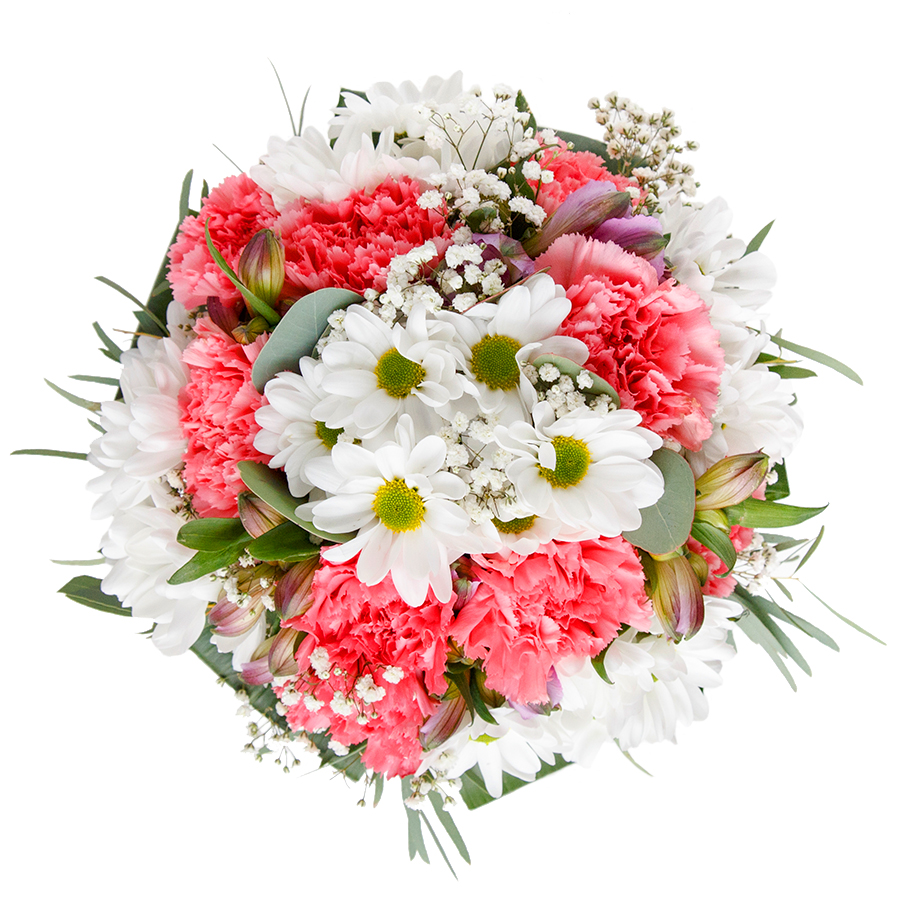 Send warmth and joy with our delicate and unique flower arrangement. This lovely bouquet features snow-white chrysanthemums, soft gypsophila, and light pink carnations, beautifully arranged with rich aspidistra leaves.